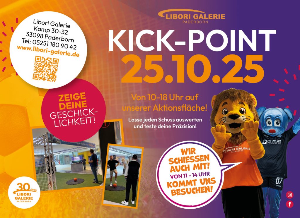 Am Samstag, den 25.10.25 findet von 10 – 18 Uhr auf der Aktionsfläche der Libori Galerie die KICK-POINT Aktion statt! Lasse jeden Schuss auswerten und teste deine Präzision.